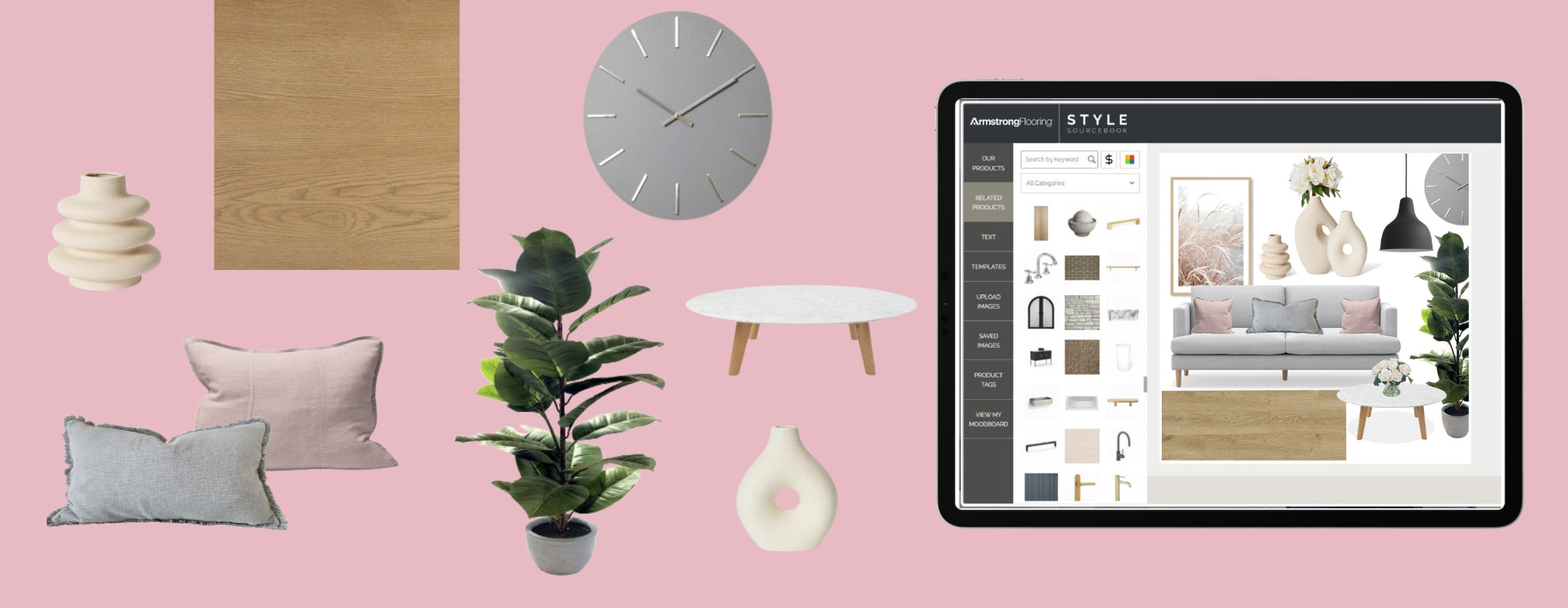 - Organisation is key - you could group your images by colour, texture or by room type. For instance, you could group images of a couch, rug, coffee table, artwork, throw and cushions together under a sub-heading of "The Living Room", and make focal pieces larger to draw the eye.